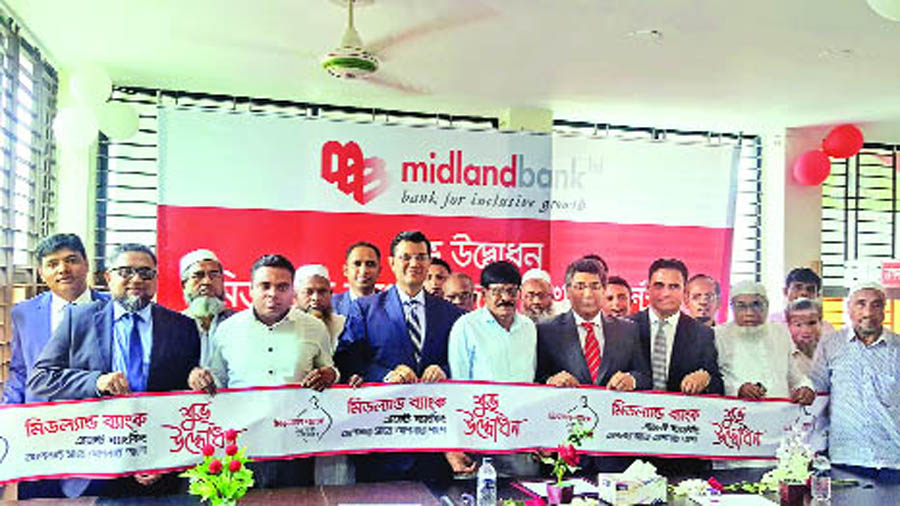 Md Ahsan-uz Zaman, Managing Director & CEO of Midland Bank Limited, along with others inaugurating an agent banking centre of the bank as the chief guest at Shibchar Bazar in Madaripur recently
