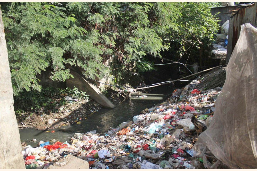 A canal filled with plastic wastes in the Baunia Badh area at Mirpur in the city. The photo was taken on Monday — Focus Bangla