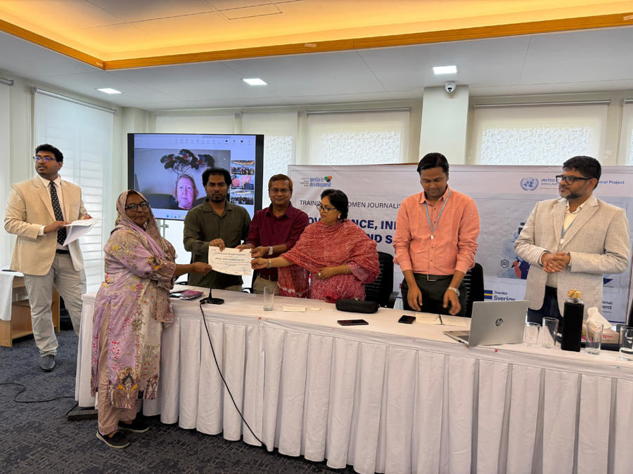 A participant receives a certificate on the concluding day of a three-day specialised training for women journalists on grassroots election reporting in Rajshahi recently. The programme was organised by UNESCO and SACMID. Among others, Professor Dr. Mozammel Hossain Bakul, Chairperson of the Department of Mass Communication and Journalism, Dr. Jannatul Jahan, Chairperson of the Department of Communication and Journalism at North Bengal International University, and UNESCO Representative to Bangladesh Dr. Susan Vize were present