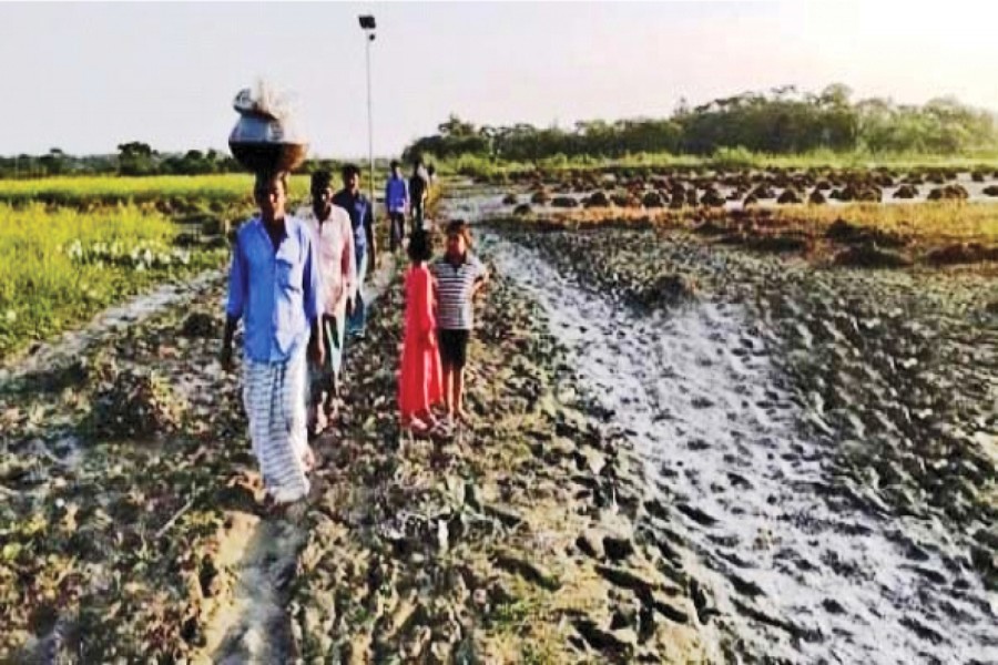 People walking along a cropland in absence of a road in Kathalia village under Kochua upazila of Chandpur district — FE Photo