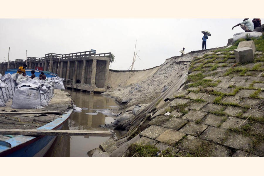 Photo shows the collapsed span of flood control dam at Dhunat upazila in Bogura district — UNB