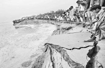 BOGRA: A big part of flood protection embankment at Sariakandi gave in following a strong current in the river Jamuna Tuesday. — Focus Bnagla