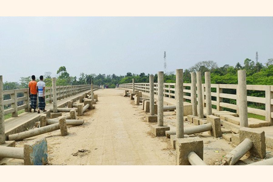 SYLHET, Apr 06: A bridge remains unused for the absence of 6.5-km approach road in Shantiganj upazila of Sunamganj district. The LGED constructed it recently on the Kalni river spending Taka 140 million for easing the link of Shantiganj upazila with neighbouring Derai and Jamalganj upazilas. Unless an all-weather approach road of the long-desired 160-metre bridge is constructed, the locals wouldn't get benefit, a number of locals said.