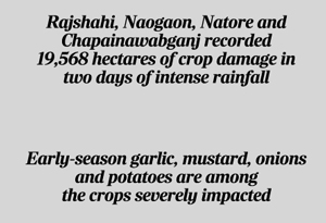 According to the Department of Agricultural Extension (DAE), Rajshahi, Naogaon, Natore and Chapainawabganj districts recorded 19,568 hectares of crop damage in two days of intense rainfall earlier this month. Of this, 1,649 hectares have been completely destroyed while 13,860 hectares suffered partial losses.