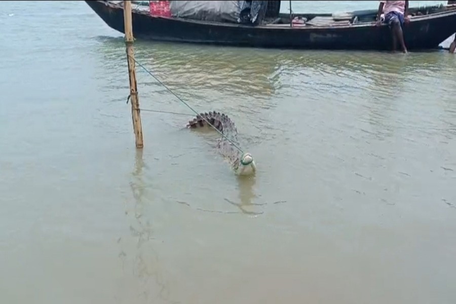 The photo shows a crocodile caught in a fishing hook near Gopalpur ghat in Charbhadrasan upazila of Faridpur on Monday — UNB
