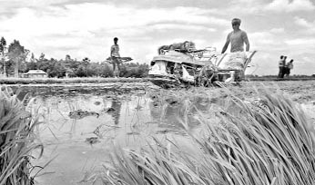 BOGRA: Farmers planting saplings with a rice tranplanter machine as a test case on a field in Nandigram area. — Focus Bangla
