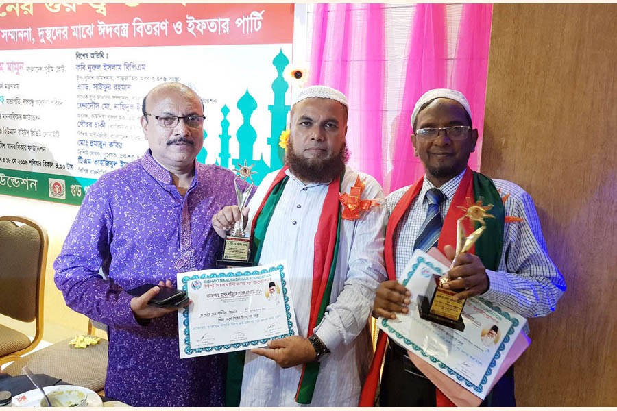 Justice Abdus Salam Mamun handing over Gyantaposh Dr Muhammad Shahidullah Golden Award to Principal of Nasratpur Degree Collage AHM Masiul Alam at a function in Bogura recently for his outstanding contribution to education — FE Photo