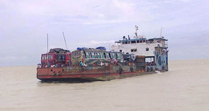 Photo: BHOLA: A ferry barge on Bhola-Laxmipur route got stuck up in shallow waters