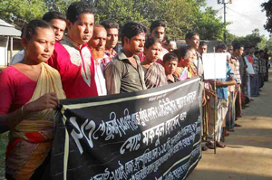 MYMENSINGH: Members of Uddipon Club of Rangamatia union in Fulbaria Upazila formed a human chain demanding construction of a bridge, Saturday. — Focus Bangla