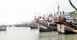 Photo: PATUAKHALI: Fishing trawlers sitting idle at Alipur ghat