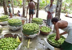 PIROJPUR: Growers sorting guava grown in Kuriana prior to sending their produce to different districts. — Focus Bangla