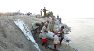 SIRAJGANJ: In a desperate attempt to stop erosion of river Jamuna villagers of Char Malshapara dumping sandbags to save the crossbar embankment from giving in. — Focus Bangla