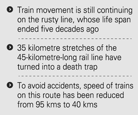 It has been seen on the ground that the life span of this British-era railway has ended 50 years ago. In most places, the wooden sleepers have rotted in the sun and rain and there is an acute shortage of necessary stones on the line.