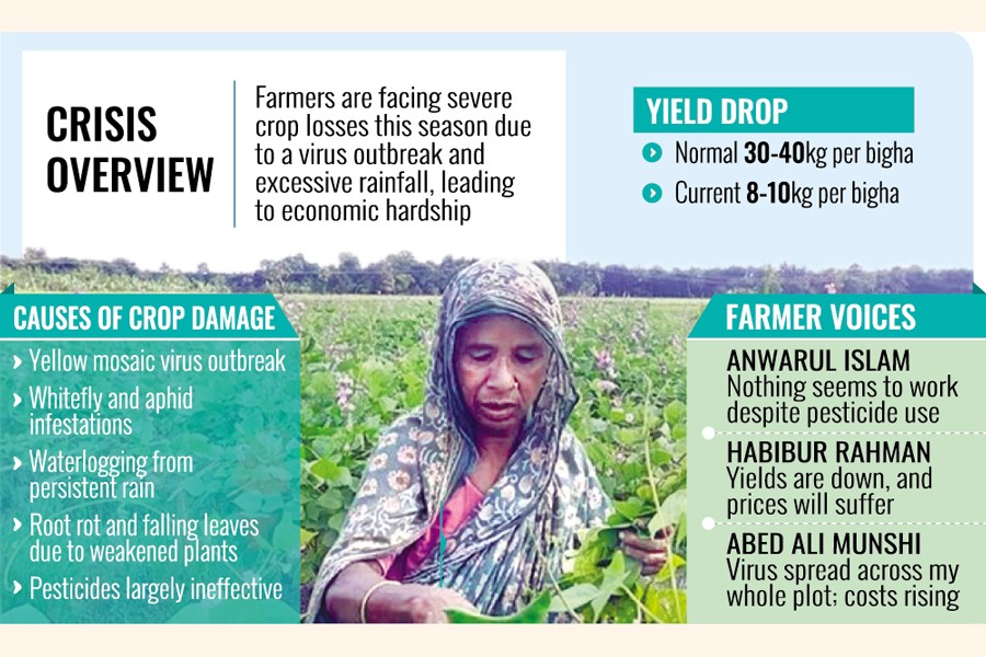Although beans are generally a winter crop, farmers in Ishwardi have long been cultivating early varieties. This year, excessive rain has led to an outbreak of a virus known as yellow mosaic, which has severely affected the fields. Additionally, infestations of whiteflies and aphids are compounding the problem. Farmers, once hopeful for a profitable season, are now distraught by the devastating turn of events.