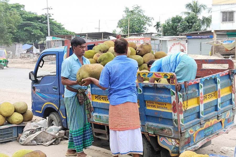 Workers unloading jackfruits from a truck for sale in a local market. The photo was taken from the Dhaka-Sylhet highway in the Ashuganj area of Brahmanbaria district — Focus Bangla