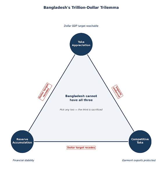 The problem is threefold, and no country can pursue all three objectives at once. A weaker taka helps exporters stay competitive and makes it easier to buy dollars for reserves. A stronger taka, by contrast, means the same output converts into more dollars and raises dollar GDP on paper, but it squeezes export margins. Building reserves means buying dollars by releasing taka into the market, which weakens the currency. So the three objectives - reserve adequacy, export competitiveness, and a trillion-dollar GDP target - pull Bangladesh Bank in incompatible directions. Only two can be served well at any one time; the third must give way. This is the trilemma at the heart of Bangladesh's exchange rate policy. The following picture summarizes it visually.