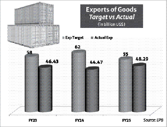 Setting the annual target of exports is a tradition for long in the country though there is no official target for imports. As earnings from export is an important source to support the country's balance of payments (BoP) as well as the economic growth, the strategic target of annual export is considered as a benchmark to determine the performance of the export-oriented industries. Following the tradition, after a modest rise in exports in the last fiscal year, the interim government has set a double digit growth target in earnings from exports of goods and services for the current fiscal year (FY26). The target for merchandise exports is set at US$55 billion for FY 2026 against the actual earnings of $48.28 billion in FY25 when the target was $50 billion. The target for services exports set at $8.50 billion against the target of $7.50 billion in the last fiscal year. Thus, the overall exports target is set at $63.50 billion for the current fiscal year.