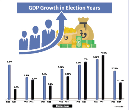 Statistics showed that GDP growth consistently declined in the four election years until 2009. The declines in FY91 and FY96 were largely driven by political conflicts and pre-poll violence. This was not the case in FY01, when the country saw less violence. The decline in FY09 followed pre-poll uncertainties under the army-backed caretaker governments. Still, the common trend was a decline in growth during election years.