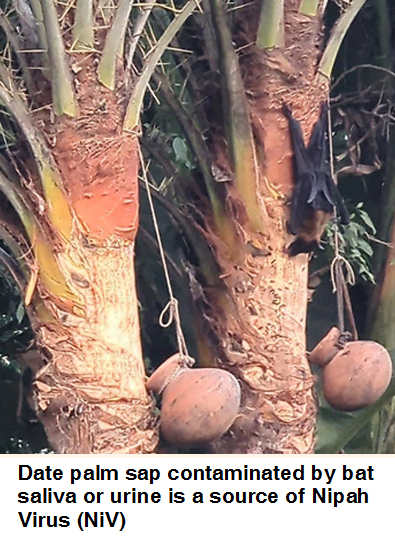 A woman aged between 40 and 50 died of Nipah Virus (NiV) infection in the northern district of Naogaon, according to WHO Disease Outbreak News. As reported, the woman developed symptoms of NiV infection which included fever, headache, muscle cramp, loss of appetite, weakness and vomiting followed by hypersalivation, disorientation and convulsions. The patient died on January 28, the same day she was admitted to hospital. She was learnt to have drunk raw date juice or sap. Notably, fruit bats (Pteropus), hosts of NiV, contaminate pots containing date palm juice hanging from the date palm trees. Traditionally, a sap collector, also called tapper (gachhi in Bengali), shaves date tree trunks at a high altitude to extract sap and collect it in earthen pots overnight. Fruit bats lick the same sap from the date palm tree at night and thus contaminate the sap with their saliva. They may also urinate in the sap to contaminate it with NiV.
