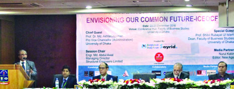 International conference on ‘Envisioning Our Common Future 2016’ was held on December 22 and December 23, 2016 with about 200 paper presenters and participants, 15 international registered delegates with more than 25 national and international professors and scientists. The conference was inaugurated with the welcome speech of Juwel Rana, convener of the conference and executive director of South Asian Youth Research Institute for Development Bangladesh and also a member of Research Committee on Social Transformation and Sociology of Development (RC09), International Sociological Association (ISA). The special guest Prof. Shibli Rubayet Ul Islam, dean, Faculty of Business Studies, University of Dhaka and chief guest Prof. Dr. Md. Akhtaruzzaman, pro vice-chancellor (administration) of University of Dhaka delivered speeches at the inauguration. On the inauguration day, the session chair was Engr. Md. Abdul Awal, advisor of the conference organising committee and managing director of Structural Engineers Limited.