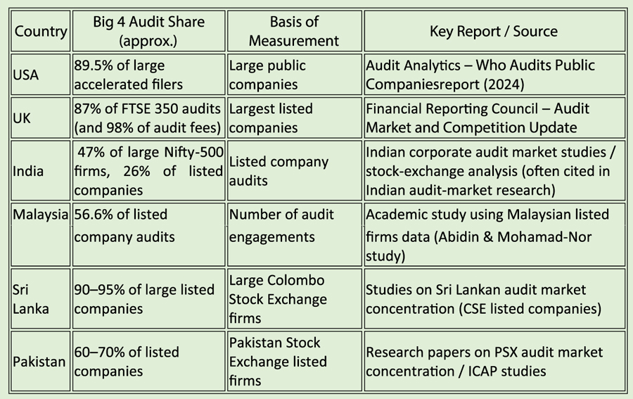 Audit concentration at the top tier is a universal feature of modern audit markets, not a regional anomaly as observed in Bangladesh. In mature markets such as the USA, the UK, and Malaysia, a small cohort of leading audit firms, most notably the Big Four, performs a majority of audits for listed and high-value entities. This concentration reflects a deliberate market alignment: clients with complex financial structures, greater public visibility, or heightened regulatory scrutiny naturally gravitate toward firms with proven capability, deep technical expertise, and established global methodologies. A review of several countries, presented in the table here, further demonstrates the extent to which the Big Four (KPMG, Ernst & Young, PwC, and Deloitte) dominate the audit landscape.