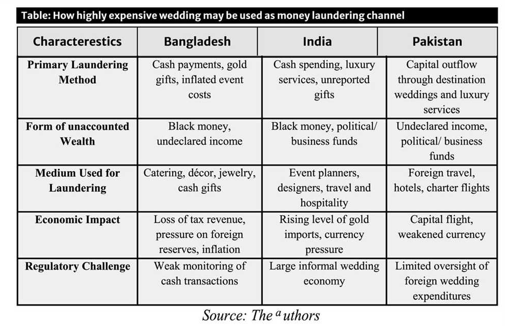 In countries like India, Bangladesh and Pakistan, overly big-budget weddings are sometimes the evidence of the money laundering that happens as weddings give a perfect opening to spend the unacknowledged sum of money. For example, in Bangladesh, the worries about unreported income and money laundering have become crucial. To launder black money, extravagant weddings are occasionally used as a medium - spending money without any limits, exchanging gifts. On the other hand, the country's economy struggles with the tax, capital outflow, and casual exhibition of unaccountable wealth. Pakistani weddings are famous for their luxuriousness too, specifically when it is a political figure or celebrity's wedding. Indian television channel NDTV World in 2025 reported that in Pakistan, one of the "Million-dollar wedding" had come under investigation because their weddings' apparent cost does not match their reported income declaration. Recently, a prominent figure of Pakistan had organized a massive destination wedding for his granddaughter which cost around248 million Pakistani Rupees.
