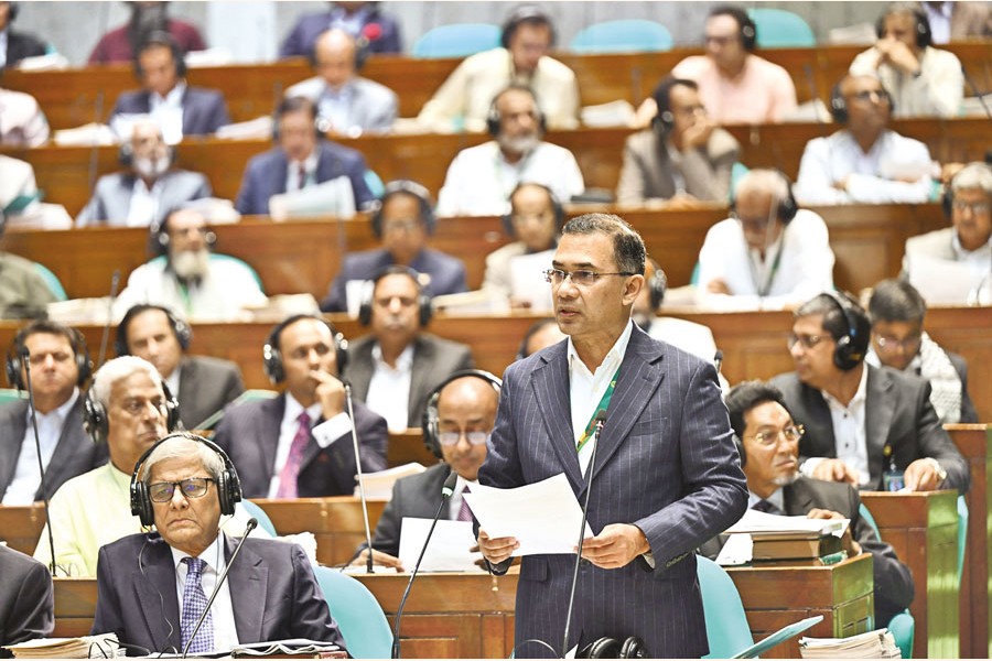 Prime Minister Tarique Rahman delivers his speech in the first session of the 13th parliament at Jatiya Sangsad Bhaban in the capital on Thursday. — PID
