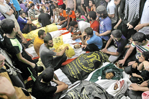 Palestinian relatives and friends mourn above the bodies of nine members of the Siam family, who were killed in an Israeli air strike that destroyed their house, during their funeral Monday at a mosque in Rafah in the southern Gaza Strip. — AFP Photo