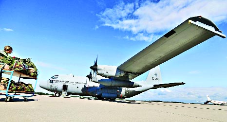 A Hercules C-130 transport aircraft of the Dutch Royal Air Force being loaded with relief supplies for the victims of humanitarian disaster in northern Iraq on an airbase in Eindhoven, The Netherlands, Monday. — AFP