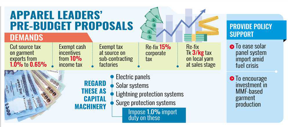 Apparel and associated industries have put forward a slew of pre-budget proposals to the government, including reducing source tax on exports and withdrawing tax on cash incentives and policy perks for solar panels and MMF garments.
