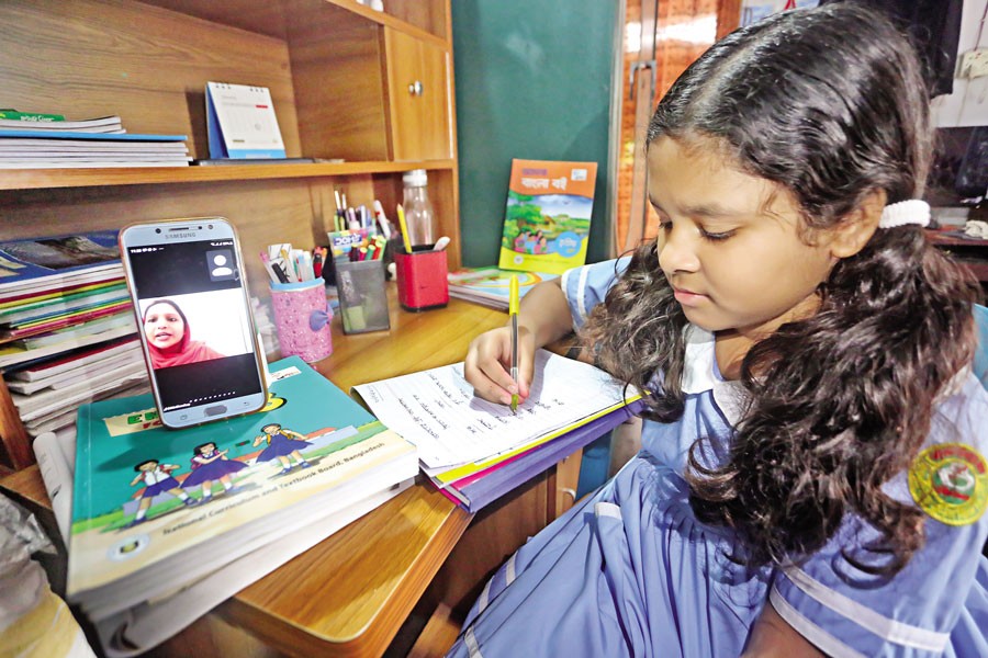 Tasnim Nishat, a third grader of Shiddeshwari Girls High School in Dhaka, attends a class on an online platform from her home at Shantibagh in the city on Wednesday. All educational institutions decided to run their classes online following the government decision to keep schools, colleges and equivalent institutions shut from January 21 to February 6, in a fresh move to contain the spread of Covid-19 infections across the country — FE photo by KAZ Sumon