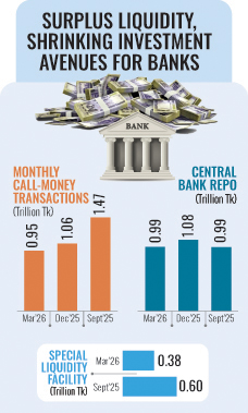 Apart from the private sector's lower credit demand, the Bangladesh Bank (BB) keeps injecting liquidity in the form of buying US dollars from the market to keep the exchange rate stable, which further cut commercial lenders' borrowing appetite, according to money market experts.