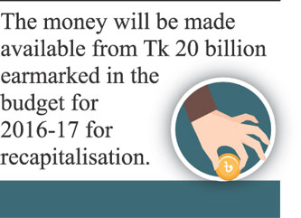 The money will be made available from a fund of Tk 20 billion that has been earmarked in the budget for 2016-17 for recapitalisation.