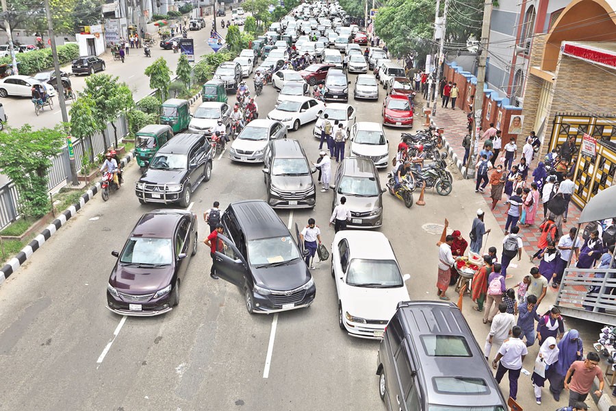Cars carrying students of Willes Little Flower School and College are dropping them off right in the middle of the road in front of the school at Kakrail in Dhaka on Sunday noon, blocking vehicular movement and thus leading to traffic gridlock in the area — FE photo by Shafiqul Alam