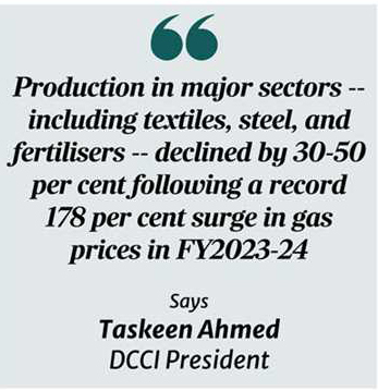 DCCI President Taskeen Ahmed said production in major sectors --including textiles, steel, and fertilisers -- declined by 30-50 per cent following a record 178 per cent surge in gas prices in FY2023-24, coupled with a further 33 per cent hike recently imposed on the industrial sector.
