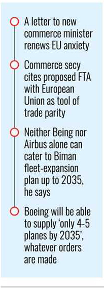 Bangladesh's US deal to buy 14 aircraft from Boeing instead of France-based Airbus, which had vied long for the supply, upsets the European Union (EU) and the bloc seeks trade parity.