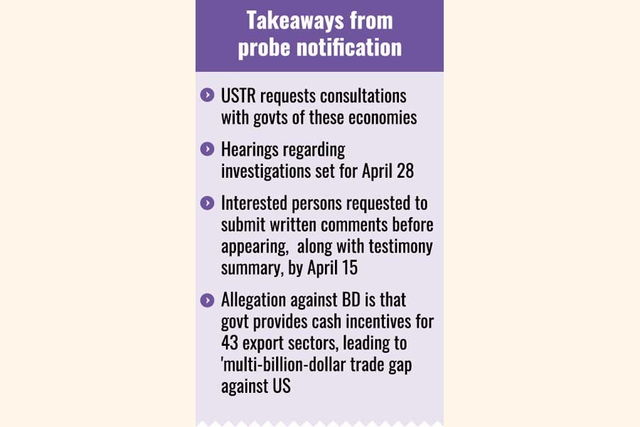 According to the Federal Register notice, the March 11 investigation allegation against Bangladesh is that government provides cash incentives for 43 export-oriented sectors, including domestic textile and leather products, which have contributed to a 'multi-billion-dollar trade gap with the United States in favour of Bangladesh'.