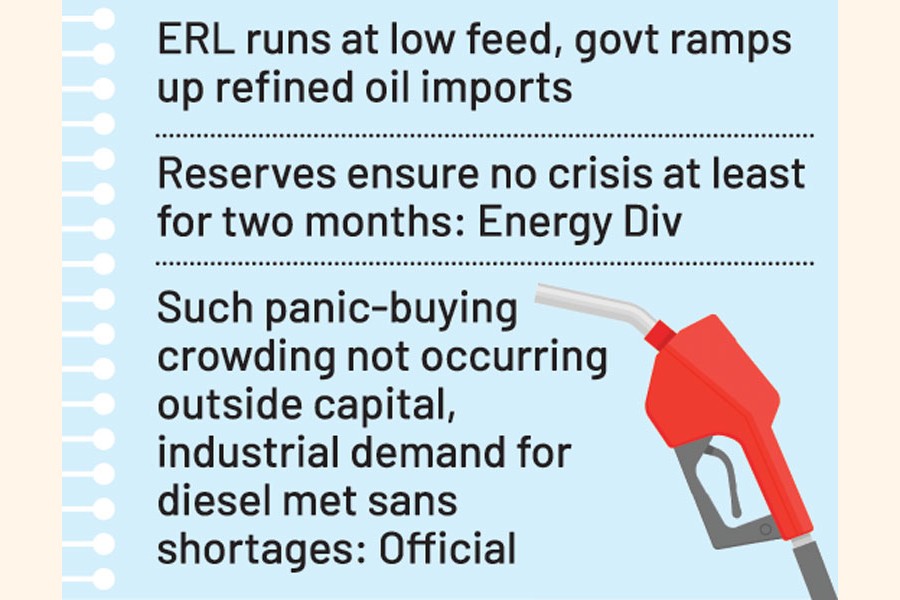 Meanwhile, a reassurance comes from Energy Division under the Ministry of Power, Energy and Mineral Resources (MPEMR) that the country will have no fuel crisis at least over the next two months due to having "sufficient reserves" of refined petroleum products like diesel, petrol, octane and jet fuel.