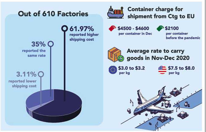 When asked, Bangladesh Freight Forwarders Association (BAFFA) senior vice president Amirul Islam said the shipment cost has increased in recent months mainly because of the growing demand against short supply.