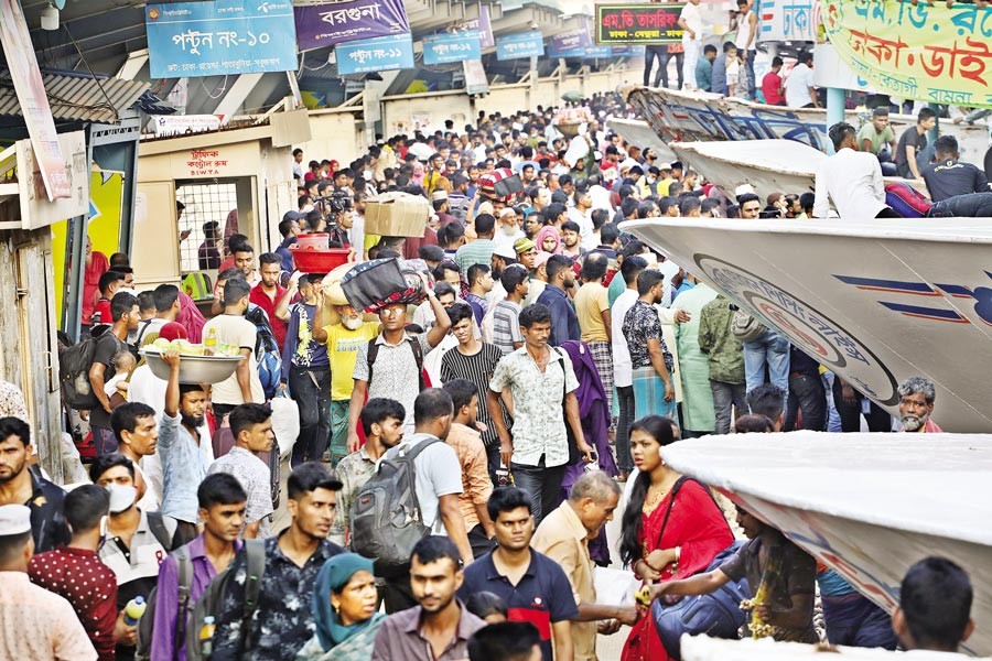Homebound people throng the Sadarghat Launch Terminal in Dhaka on Thursday afternoon as they travel to villages ahead of the Eid-ul-Fitr. Every year, millions of city-dwellers leave the capital like this to celebrate the festival with their near ones — FE photo by Shafiqul Alam