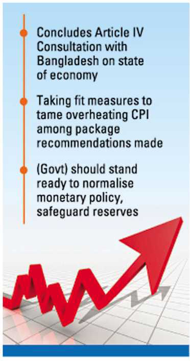 "(The IMF) directors highlighted the need to closely monitor inflation developments and stand ready to normalise monetary policy," the IMF says in a statement issued Thursday after conclusion of Article IV Consultation with Bangladesh.