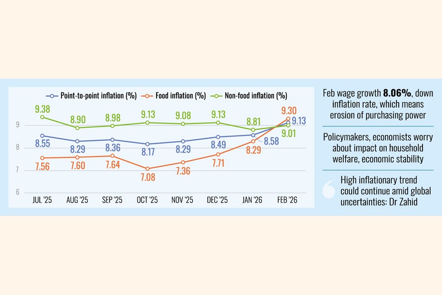 Meanwhile, BBS data also showed that the national wage-growth rate stood at 8.06 per cent in February, remaining below the inflation rate.