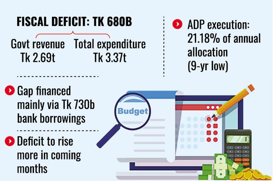 Government revenue during the period under review totalled Tk 2.69 trillion, including both tax and non-tax receipts, while total expenditure reached Tk 3.37 trillion, resulting in the deficit.