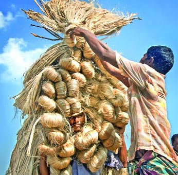A farmer helping another carry home processed jute fibre in Islampur, Jamalpur, Sunday. Local jute cultivators are concerned over getting fair prices of the produce this season. — Focus Bangla