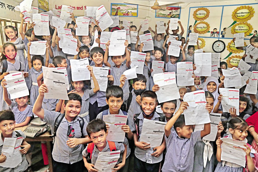 Kids hold aloft their Covid vaccine registration cards out of jubilation as they wait to receive shots at the Mohakhali Abdul Hamid Dorji Govt Primary School in Dhaka on Thursday. The government rolled out a drive to vaccinate children aged 5-11 years against the coronavirus in 12 city corporations across the country on the day — FE photo