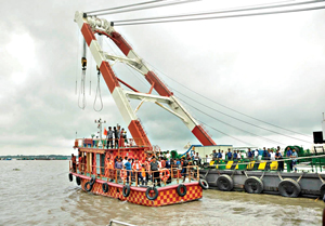 Rescue operation continued in the Louhajong channel of the Padma at Mawa in Munshiganj Thursday to spot the sunken launch four days after it went down with more than 300 people on board. — Focus Bangla