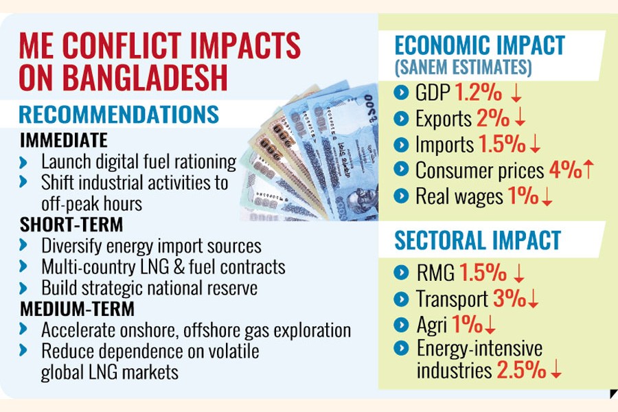 The SANEM analysis identifies three major transmission channels - energy, remittance, and trade and logistics - through which the conflict could affect the Bangladesh economy.