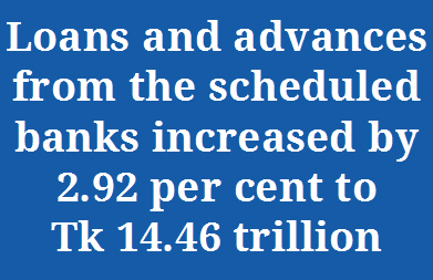 Loans and advances from the scheduled banks increased by 2.92 per cent to Tk 14.46 trillion during the period under review.
