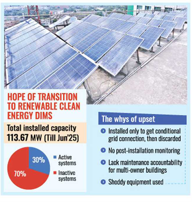 Over a decade of policy push had only 113.67-megawatt-capacity panels installed across the capital city, but nearly 70 per cent of the rooftop solar systems in DPDC area are found inactive due to weak maintenance, monitoring gaps, and multi-owner residential complexities.