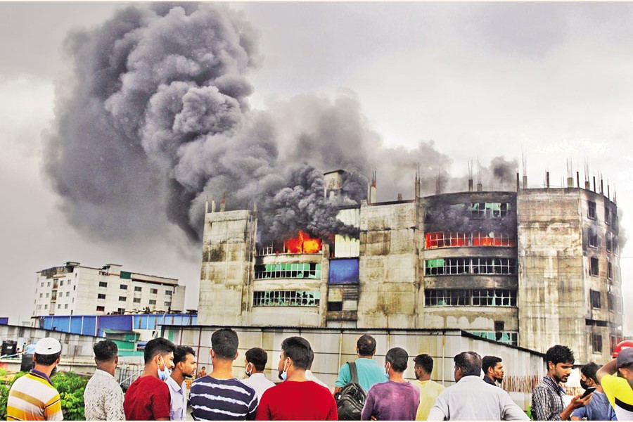 Fire and smoke billowing out of the Shezan juice factory in Narayanganj with relatives anxiously waiting outside for the news of their near and dear ones on Friday as the fire broke out on Thursday — FE photo
